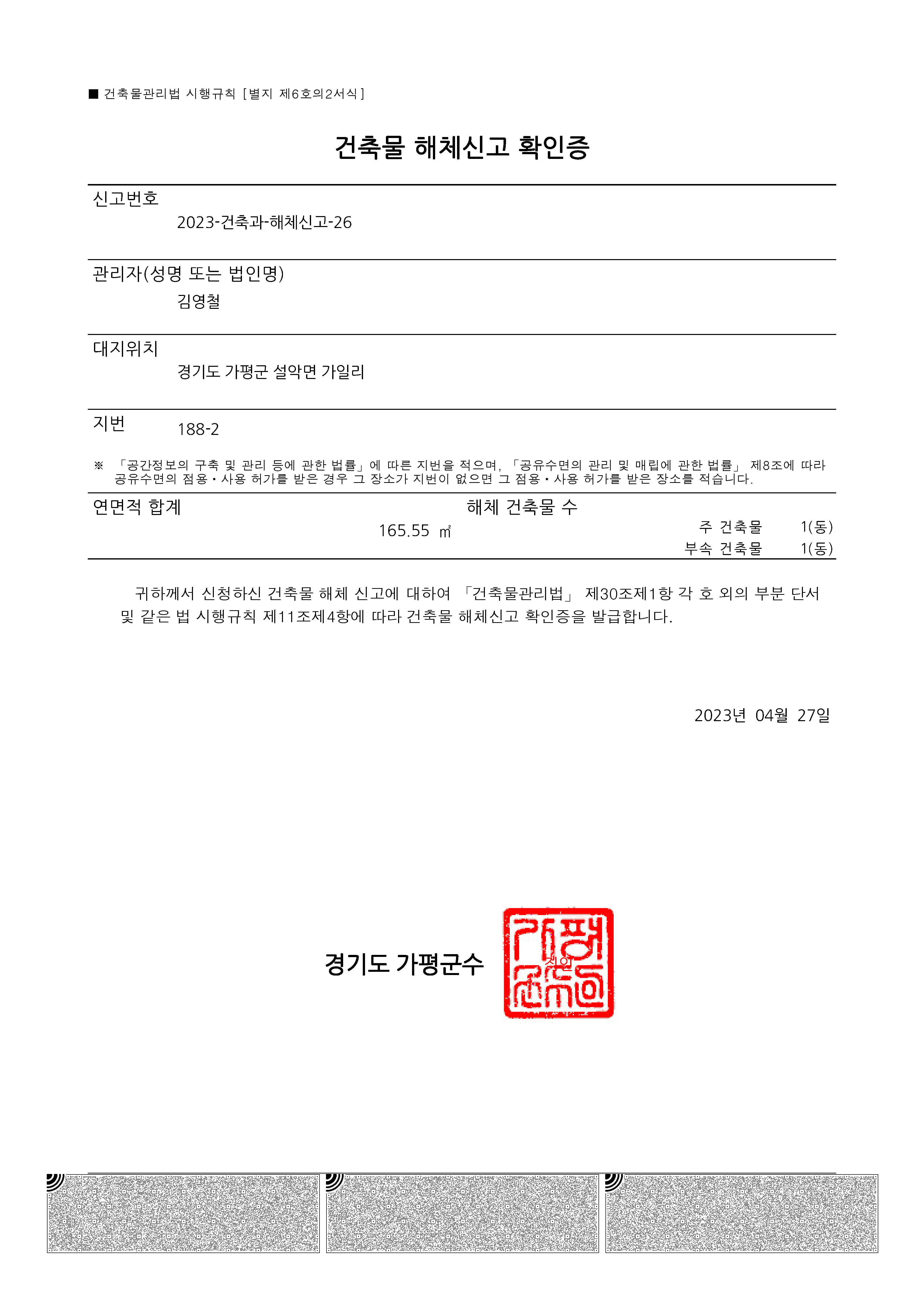 가평군 설악면 가일리 188-2 건축물 해체계획서용역(신고)