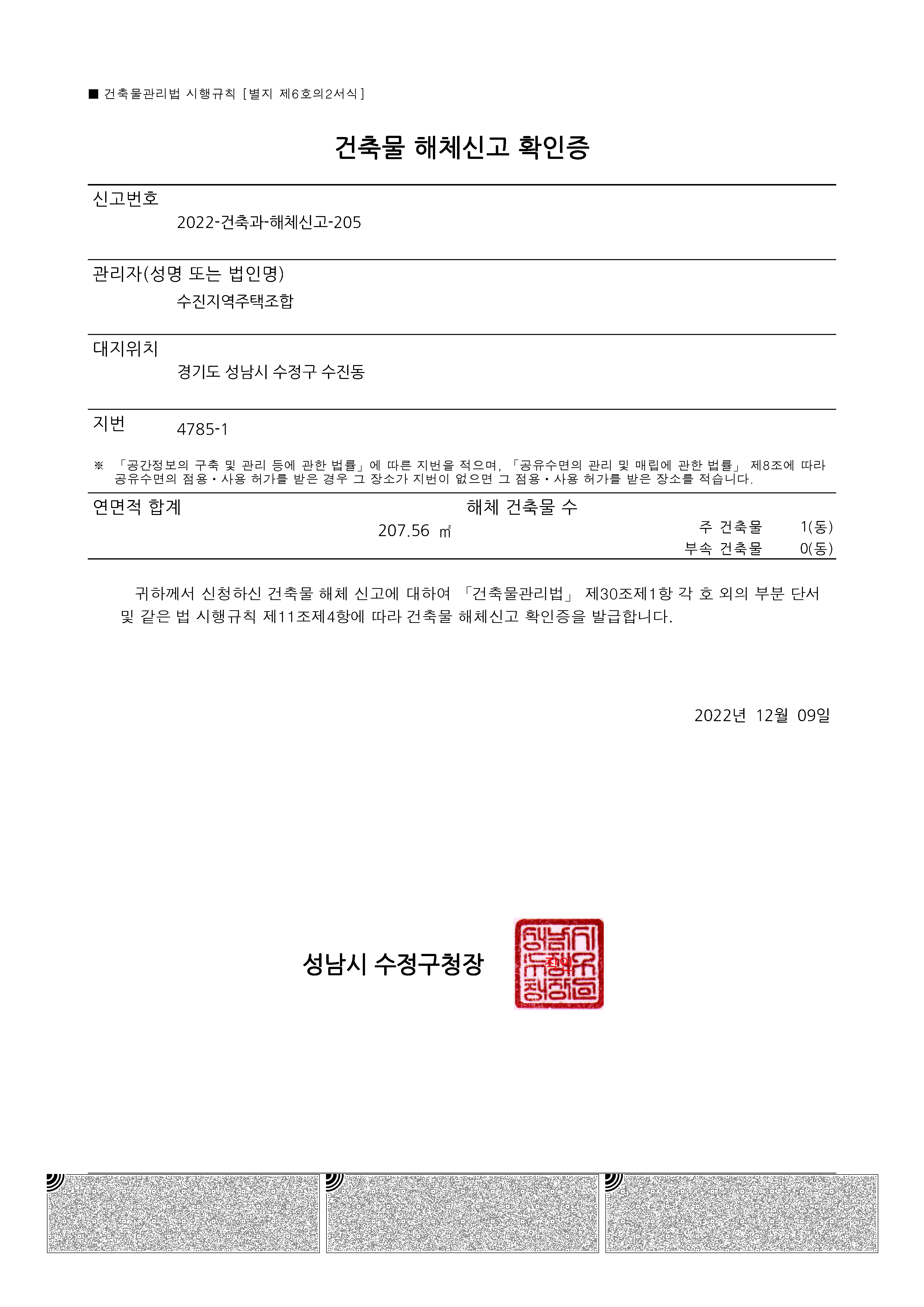 성남시 수정구 수진동 4785-1 건축물 해체계획서용역(신고)