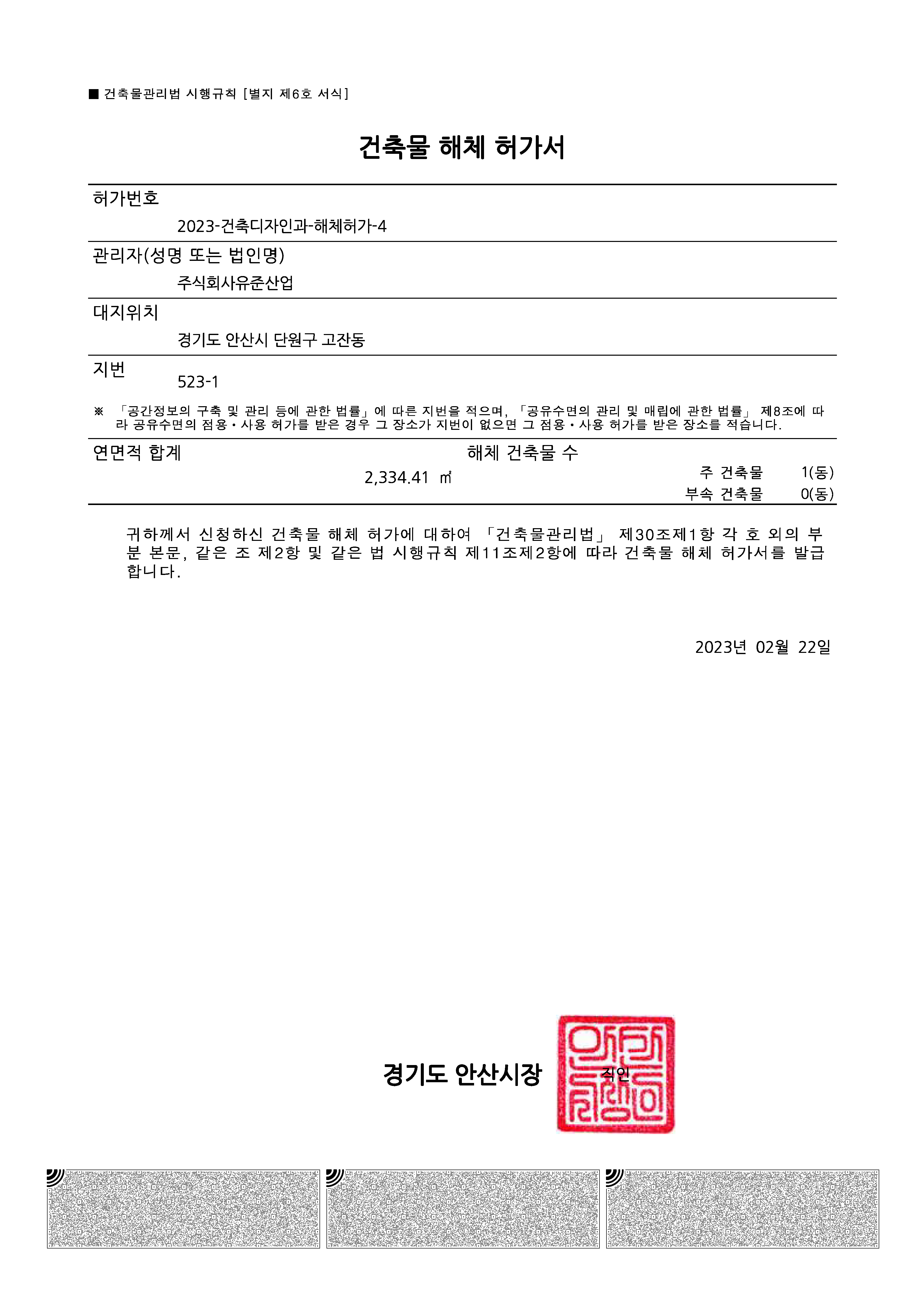 안산시 고잔동 523-1 건축물 해체계획서용역(허가)