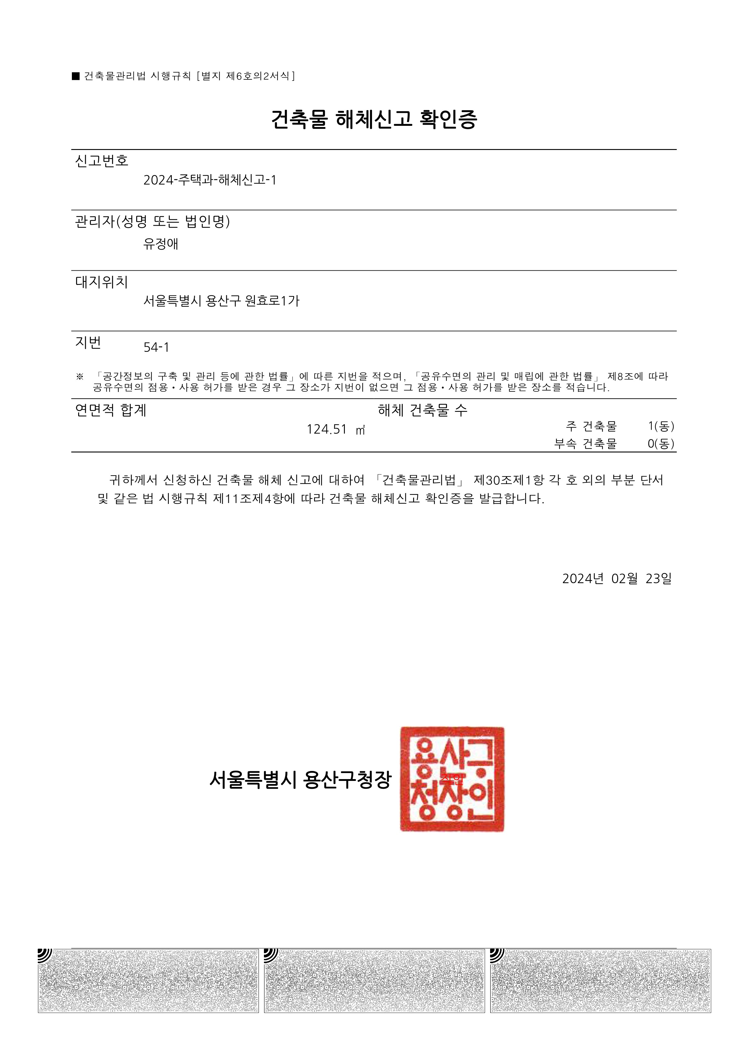 용산구 원효로1가 54-1 건축물 해체계획서용역(신고)