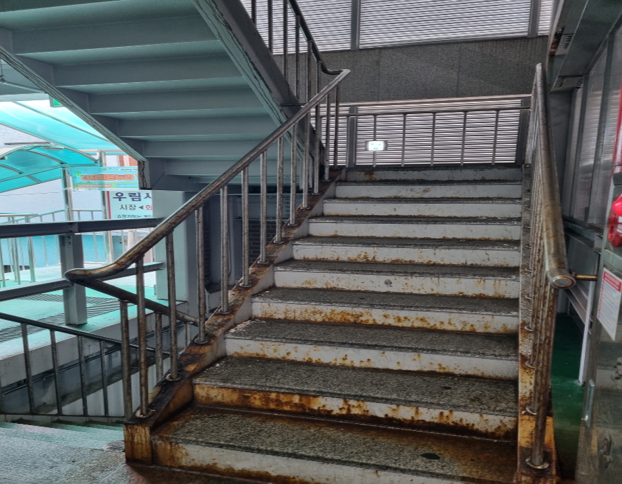 기존 주차장이 전반적인 노후화와 구조적 보강 필요성이 있어 보입니다. 특히 계단 부식, 바닥 크랙 등 보수 및 도색 작업을 포함하여 내구성과 미관을 향상시키는 방향으로 설계를 진행하고 있습니다. 기존 차로폭이 5m로 기준 미달되어 6m 확보 및 2종 일반주거지역이어서 용적률 완화 검토 및 협의 예정입니다.